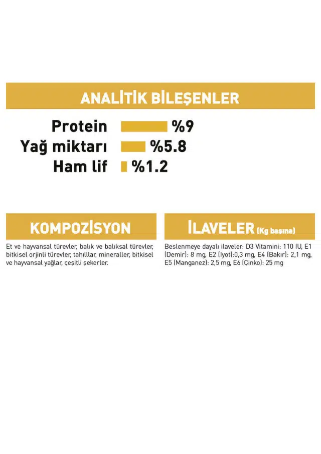 Analitik Bileşenler Olarak Protein %9,0, Yağ İçeriği %5,8, Ham Kül %2,0, Ham Lif %1,2 Ve Nem %78,5 Değerlerine Sahiptir. Bu Dengeli Besin Profili, Köpeğinizin Sağlıklı Bir Şekilde Beslenmesini Destekler.